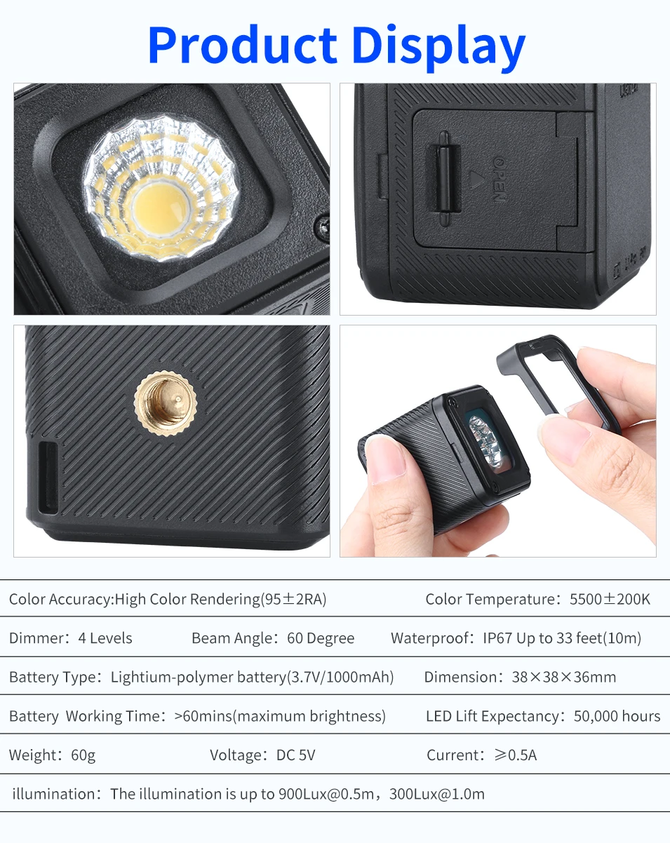 1. Самый универсальный приключенческий светодиодный светильник-для профессионального фото, видео, подводного плавания, велосипеда, лагеря, дрона, безопасности и веселья. 2. Светодиодный светильник с регулируемой яркостью и 4 уровнями цветовой температуры 5500 K. Использование шарика из материала COB, которая имеет высокую цветопередачу, индекс 95 и длительный срок службы (50000 часов) 3. IP67 полностью водонепроницаемый до 33 футов (10 м). Мини-размер 1,5 дюйма кубический, только 0.13lbs, легко хранить и переносить. 4. Поставляется с 20шт цветными гелями для создания различных эффектов, приносят более красочное применение. 5. Аккумулятор емкостью 1000 мАч. И скрытый зарядный порт type-C, для защиты. 6. l1 Pro с холодным башмаком и отверстием для определения местоположения 1/4-20 можно установить непосредственно на штативы/Моноподы или селфи-палки, подходит для большинства DSLR камер, дроны DJI Osmo карман Gopro 7/6/5 SJCAM экшн-камер и смартфонов видео туристического снаряжения. Что входит в комплект: 1x ULANZI L1 pro video lght 1x холодным башмаком для головы 1x20 цветных фильтров 1x кабель для зарядного устройства 1x слинг веревка ремень